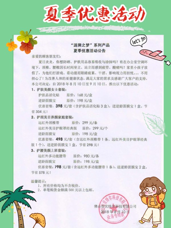 優(yōu)特爾公司為改善人體亞健康狀態(tài),解決大家的煩惱,于8月10日-9月10日特推出以下優(yōu)惠活動,送人自用都適合,讓你輕松、愉快樂享夏季!